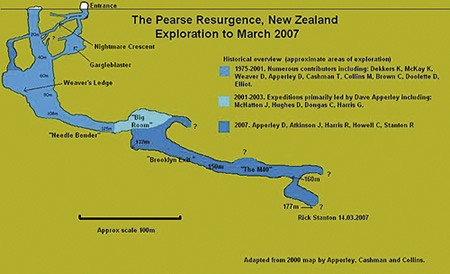 Weil das Höhlensystem doch recht abgelegen liegt, mussten fünf Tonnen Ausrüstung per Helikopter eingeflogen werden. Das Team hielt sich insgesamt drei Wochen an Pearse Resurgance auf.