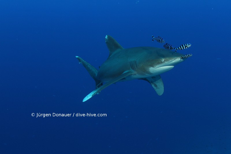 Kaum 10 Minuten später ein weiterer Weißspitzen-Hochseehai in Sicht. Definitv ein anderer und etwas kleiner als der erste, aber immer noch gute 2 Meter groß. Auch dieser zeigte sich sehr neugierig und schwamm unglaublich nah an uns heran und recht aggressiv wieder weg. Das wiederholte der Hai und wir beschlossen, etwas aus seinem Bereich zu schwimmen. Provozieren will man diesen Kameraden sicher nicht – in 20-25 Metern Tiefe im offenen Ozean ist er eindeutig der Chef – und das wollte er uns vielleicht mit seinem Verhalten auch klar machen.