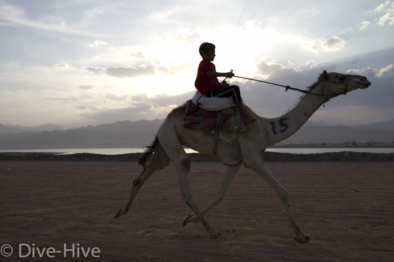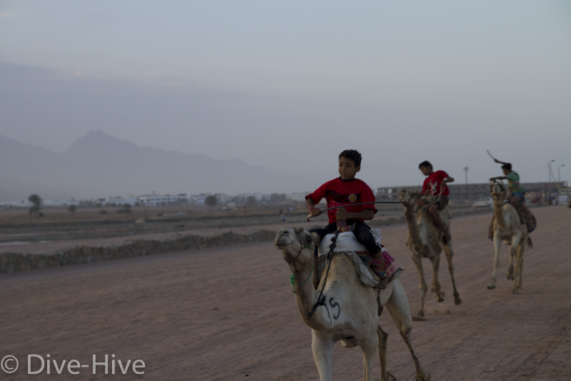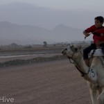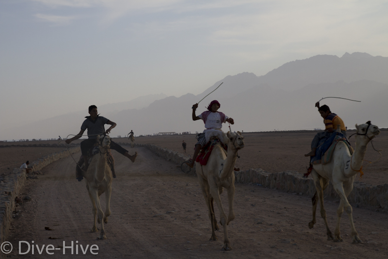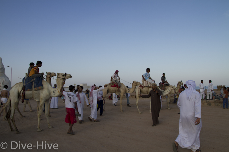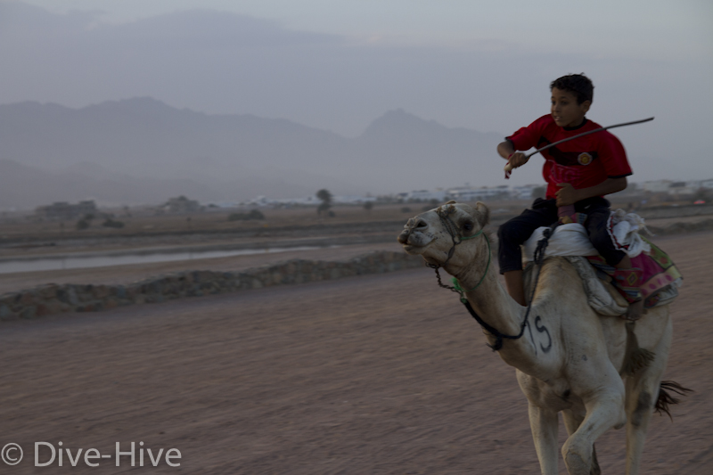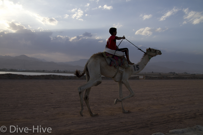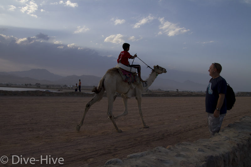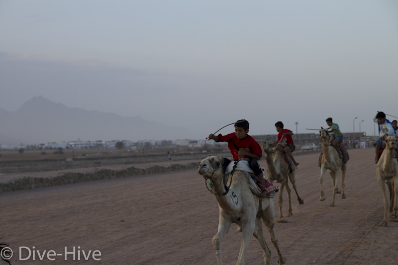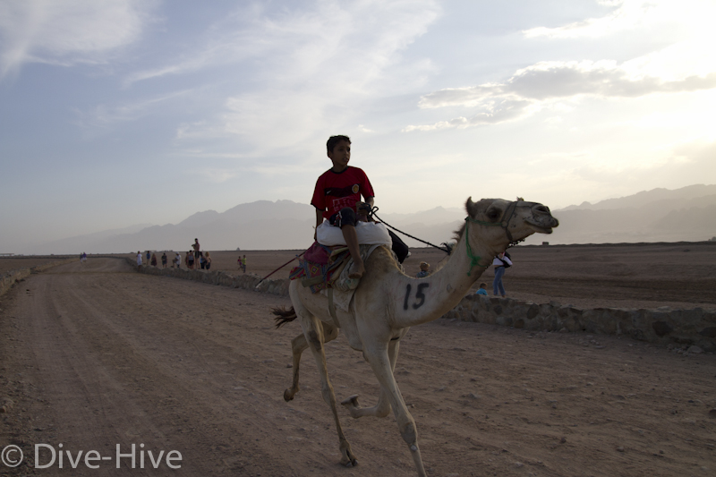 Somit haben wir kein Bild vom Gewinner. Wir haben uns irgendwo in der Mitte postiert und von da Bilder geschossen. Es iest sich wie eine kleine organisatorische Katastrophe, aber es war ganz das Gegenteil. Viele Leute fanden sich ein und es war ein großer Spaß. Im Endeffekt war der Gewinner nicht das Wichtigste – Dahab hat gewonnen – das ist sicher. Genießt einfach die Bilder. Sie sind etwas dunkel geworden, weil das Rennen spät Nachmittags stattfand. Das war sicher kein nachteil für die Renn-Kamele. Während des Tages ist es einfach zu heiß. Die Sonne beschloss dann noch genau zum richtigen Zeitpunkt entschlossen, sich hinter ein paar Wolken zu verstecken.