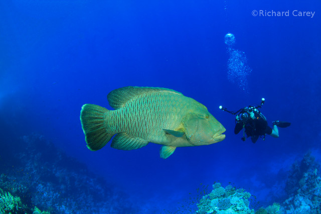 Glück für mich, dass Rich auf dem selben Tauchgang mit seiner DSLR war. Somit hab ich ein tolles Bild einem großen Napoleon mit mir im Hintergrund. Für mich ist das Bild etwas besonderes, da ich normalerweise nicht in Bildern vorkomme (andere Seite der Kamera).