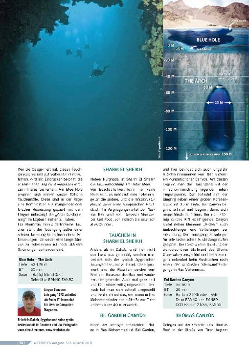 Ich bin natürlich entzückt und begeistert! Jeder würde es sein, wenn es eines seiner Bilder in ein Tauchmagazin schafft und dabei noch fast eine halbe Seite ausfüllt. In meinem Fall ist das ein Bild vom Arch in Dahab, Süd-Sinai, Ägypten.