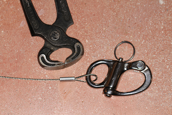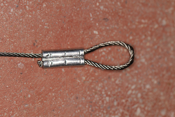 - Eine Schlaufe erstellen indem man das Drahseil durch die Klemmhülse führt und die Hülse anschließend sorgfältig von allen Seiten sehr fest zuquetscht. Hier kann ein starker Mann ausgesprochen hilfreich sein. Die Schlaufe soll später in den großen Karabiner eingefädelt werden und sollte nicht zu weit sein, damit sich das Seil nicht verheddert, aber auch nicht zu eng, um dem Karabiner ein wenig Spiel zu lassen.Wenn die Klemmhülse gut verschlossen ist, rutscht das Seil nicht mehr hin und her, auch nicht unter sehr starkem Zug.