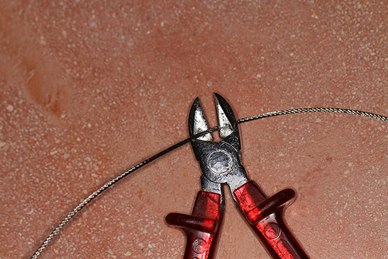- Etwa 2 m Edelstahl-Drahtseil mit ca. 2-3 mm Durchmesser Gut eignet sich flexibles, rostbeständiges Material aus mehreren Fäden. Das gibt es zum Beispiel in Läden für Angel- oder Segelbedarf und kostet pro Meter ungefähr 1,50 Euro.