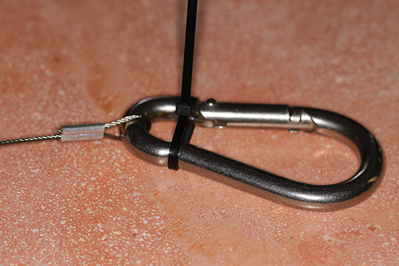 Schlaufe um den Schnappschäkel bilden - Nun ist der “handwerkliche” Teil eigentlich schon vorbei. Jetzt hängst du den großen Karabiner in die freie Schlaufe ein und trennst den unteren Teil des Karabiners mit einem Kabelbinder ab. Das abstehende Ende einfach abschneiden.