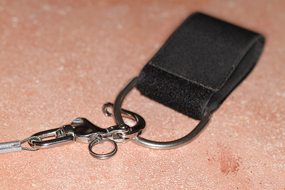 - Der Schnappschäkel wird nun in den D-Ring des Armhalters eingehängt. Am Verschluss des Schnappschäkels kann je nach Wunsch noch ein Band angehängt werden, um diesen besser kenntlich zu machen.