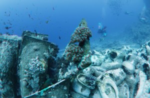 Im vierten Bild spricht man von „ausrangierten Toilettenschüsseln“ im Roten Meer. Das ist nicht ganz richtig, weil es sich hier um den Tauchplatz Yolanda im Nationalpark Ras Mohammed handelt. Das Wrack hatte Sanitär-Anlagen geladen und ist gegen das Riff gedonnert und gesunken. Der Körper des Schiffs selbst ist irgendwann in die Tiefe abgerutscht und liegt auf ungefähr 200 Meter.